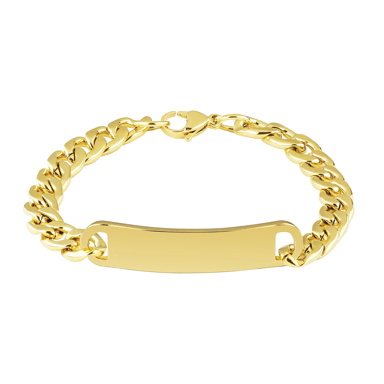 Schmuck mit Symbolwirkung: Das breite ID-Armband mit Gravur wirkt tough und edel zugleich. Durch die individuelle Wunschgravur wird das Accessoire zum ausdrucksstarken Unikat. Bestehend aus hochwertigem Edelstahl in schlichtem Gold, besitzt das Armband eine Länge von 21cm und überzeugt durch eine elegante Optik.